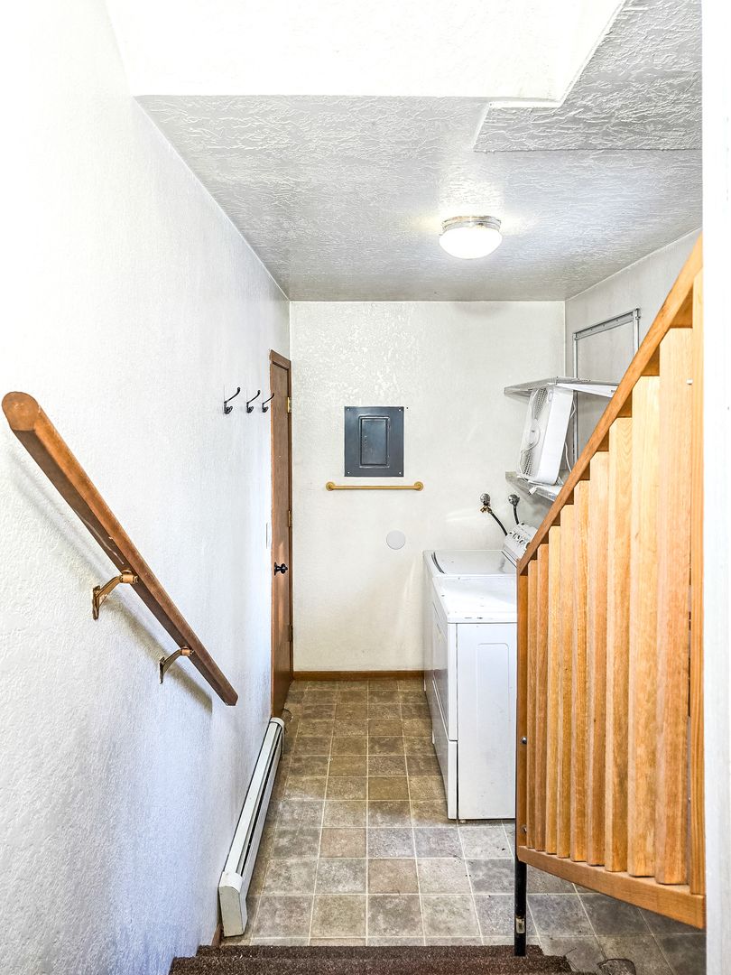 The kitchen is equipped with stainless steel appliances and provides direct access to a back porch and a fenced yard area. Just off the kitchen, you’ll find a separate laundry room with an in-unit washer and dryer. The home also includes a one-car garage with direct entry into the unit. Curbside trash pickup is available every Monday.