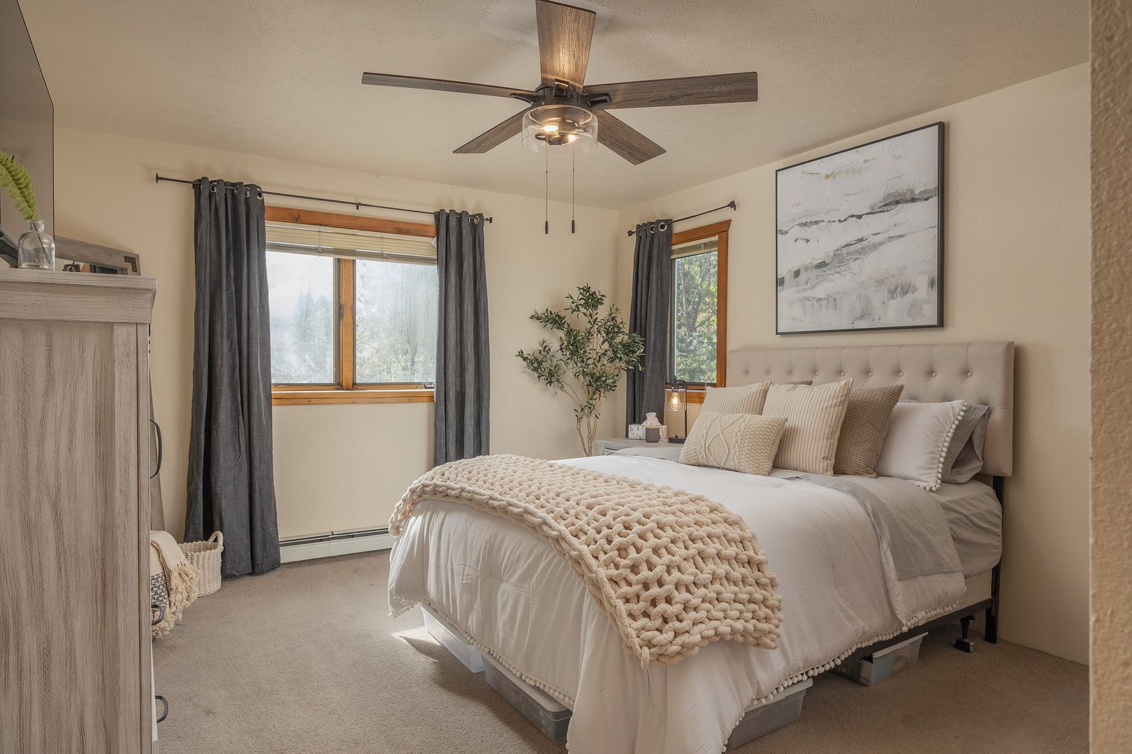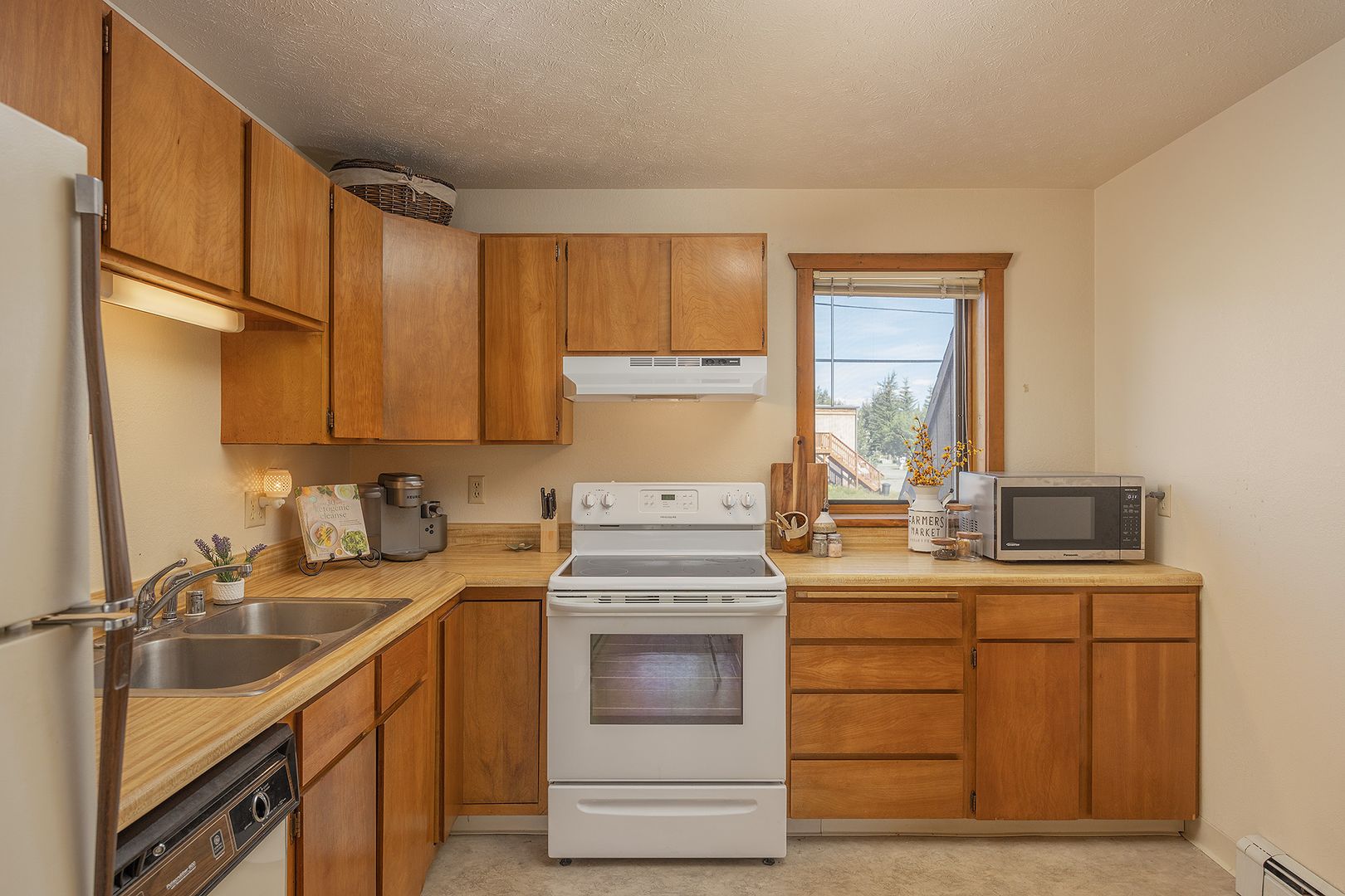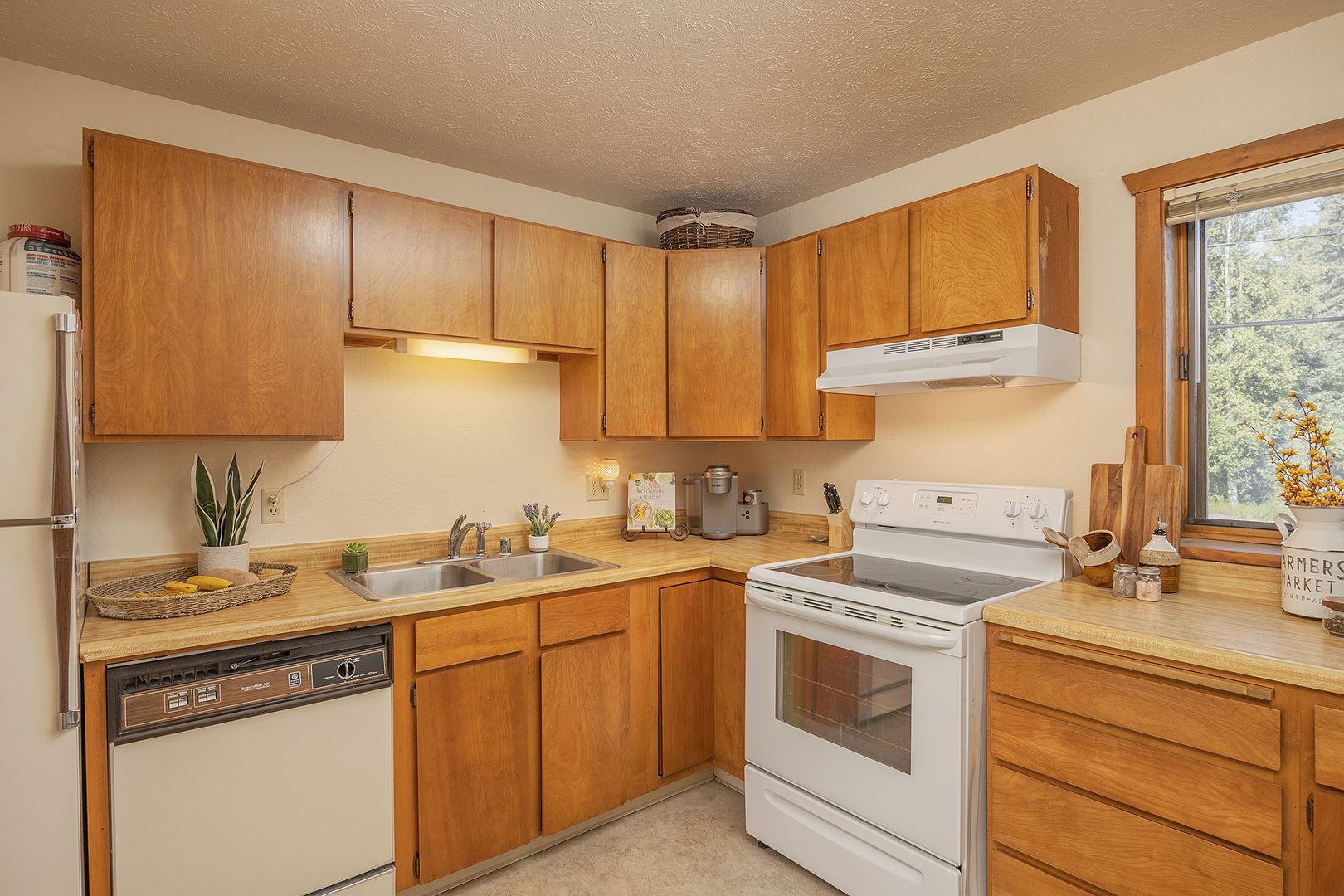 Inside, you'll find ample storage space to keep your belongings organized, along with appliances such as a refrigerator, stove/oven, and dishwasher, making meal prep a breeze. (New fridge and dishwasher not pictured) Stay comfortable year-round with ceiling fans to keep you cool in the summer and window coverings for added privacy.