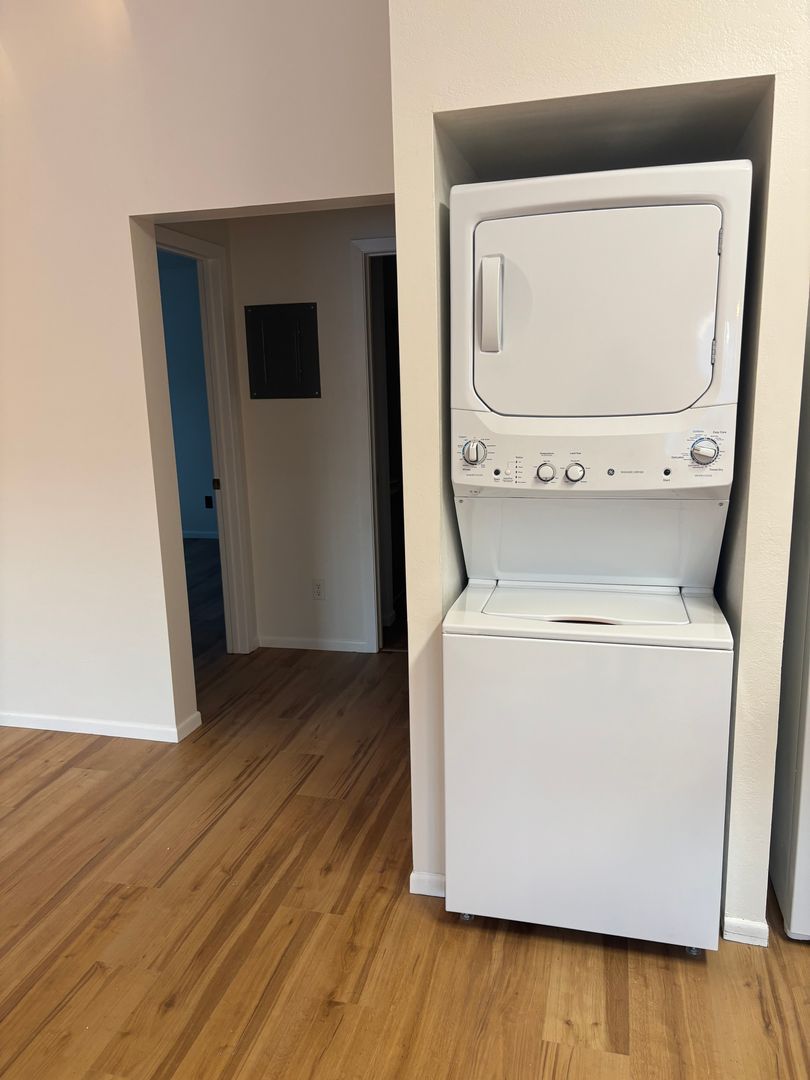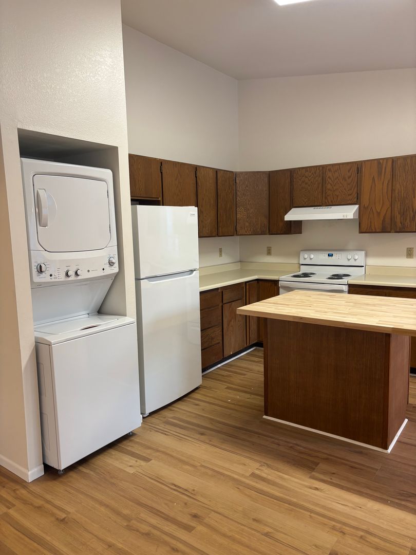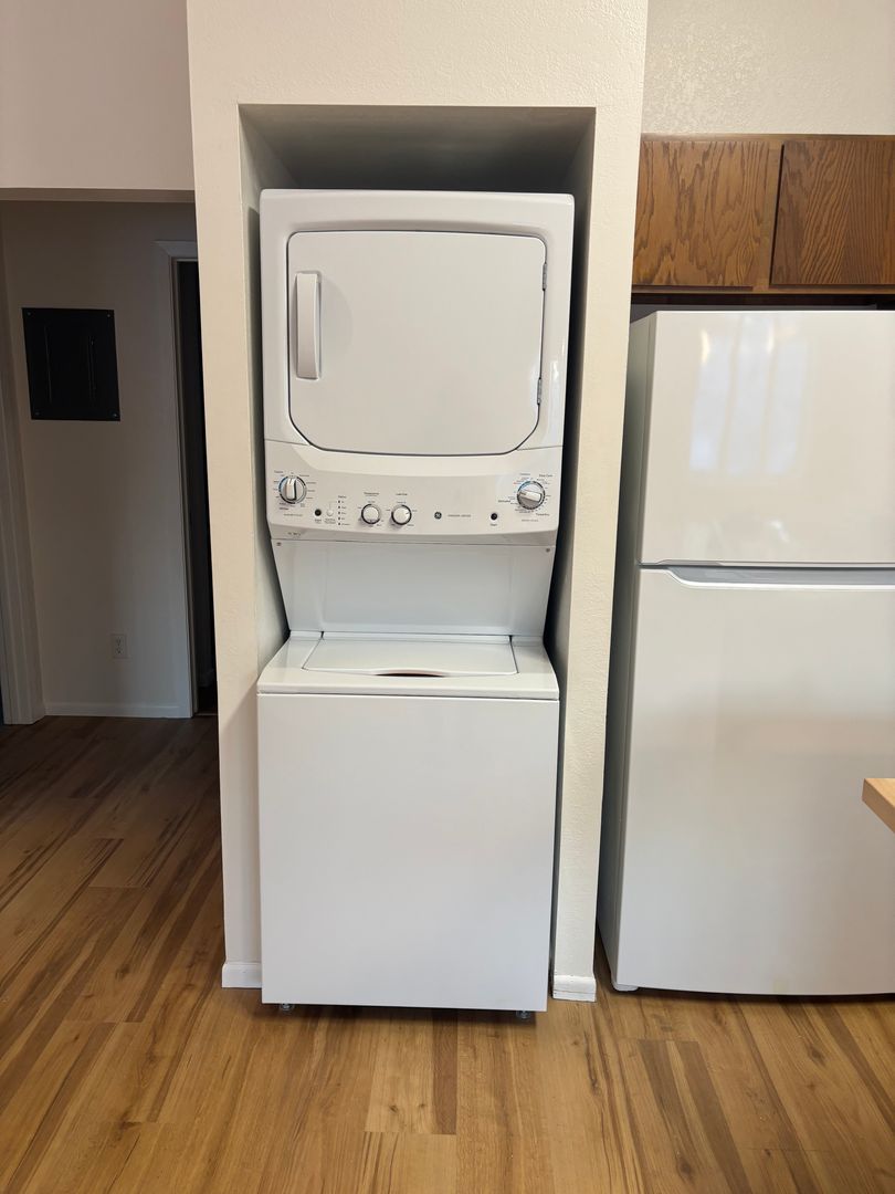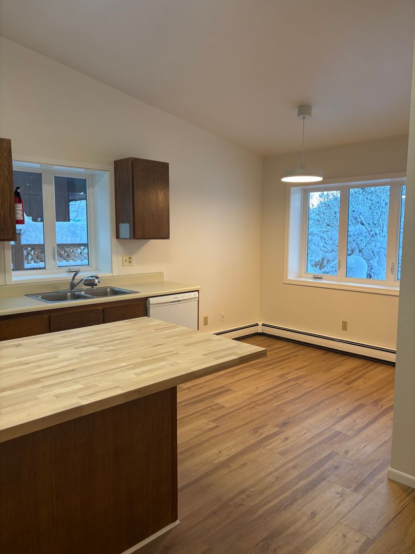 Recent updates include brand new windows throughout, along with new flooring, lighting, and fresh paint. The unit offers a welcoming Arctic entry with ample storage for coats and boots. The kitchen provides plenty of cabinet space and includes a small island with a new butcher block countertop. Appliances include a dishwasher, new stacked washer and dryer, new stove, and new refrigerator. A cozy dining area is located just off the kitchen.
